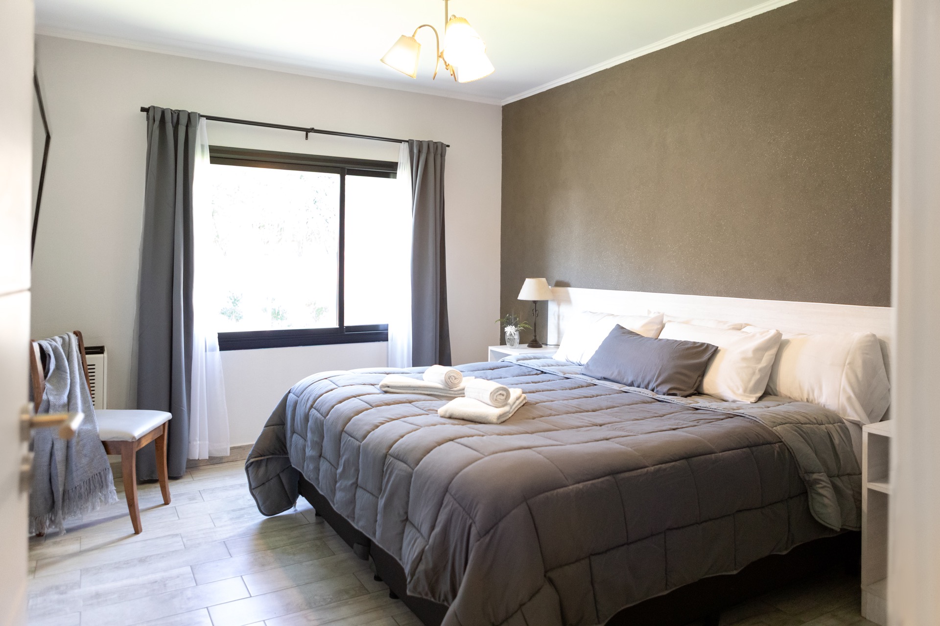 La cabaña N° 2 se encuentra en otro sector del complejo, con acceso independiente a los aparts. Unidad de 2 ambientes con una superficie de 65 m2 y capacidad máxima para 6 personas. Cuenta con cocina independiente y living-comedor donde hay 2 sommier simples y 2 sommier carrito. Antebaño y baño con ducha.